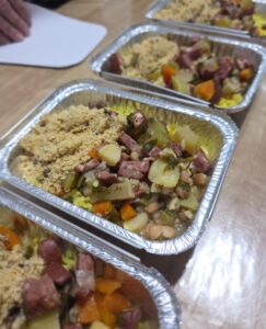 Batata doce, chuchu, cenoura, batata inglesa arroz e Proteína de Seja. Rico em vitaminas essenciais para fortalecer a imunidade do irmão em condição de rua.