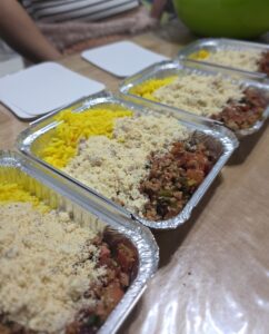 Servido com Arroz, Feijão e Farofa. Um total de 60 refeições